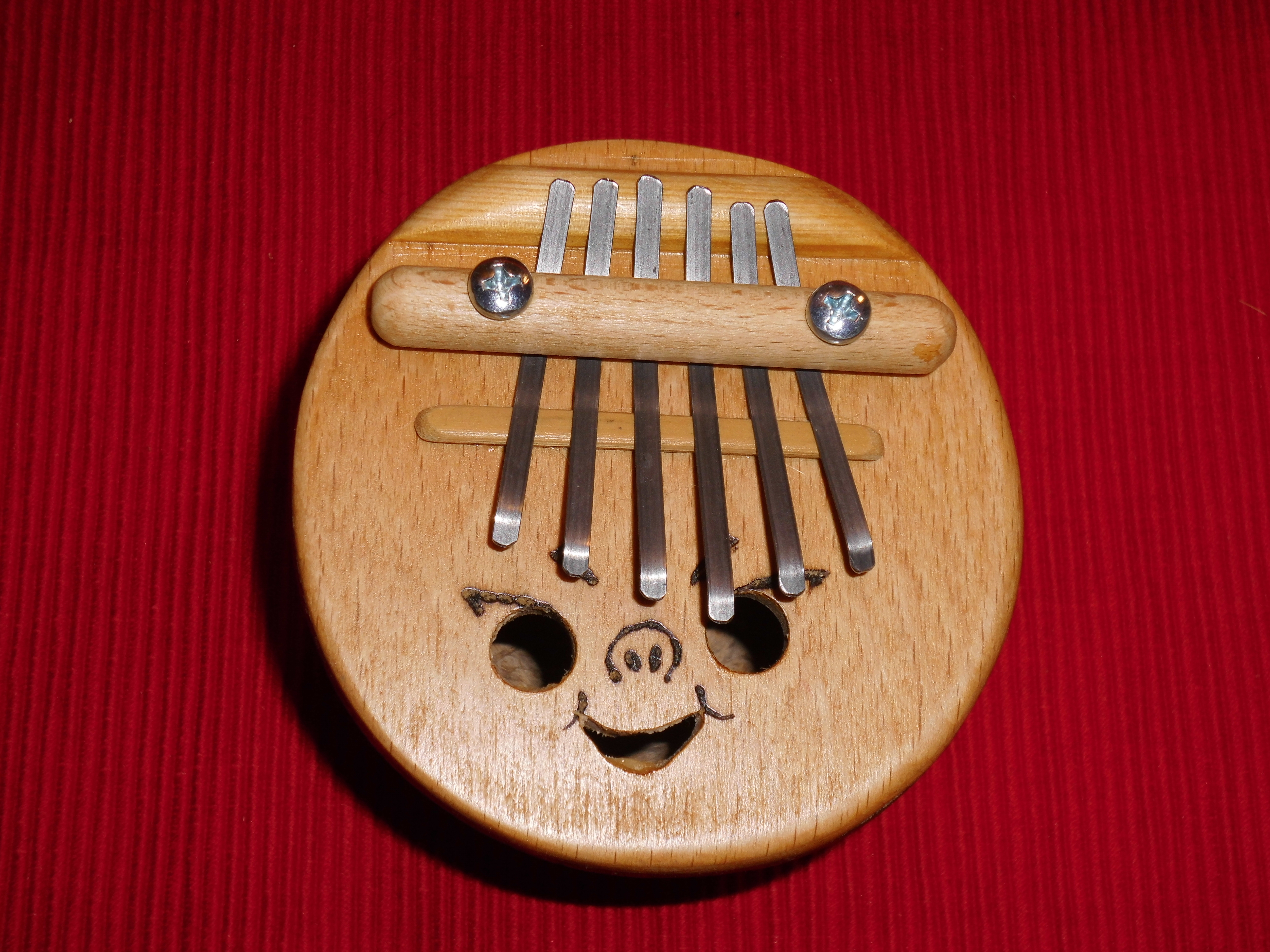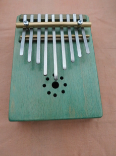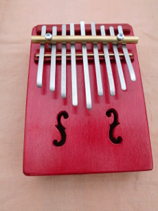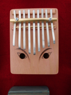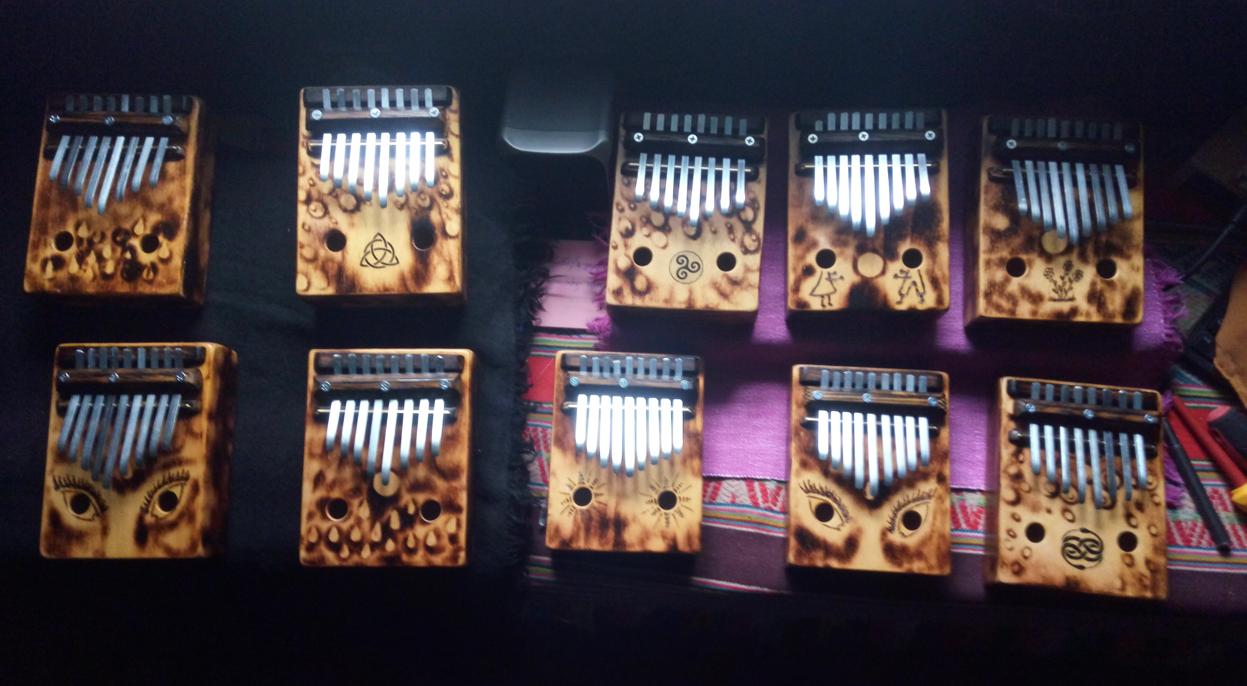 Nuestra kalimba ha ido por fases de desarrollo que probablemente seguirán. La caja de resonancia es un rompecabezas de maderas unidas herméticamente y trabajadas en su interior; el mecanismo de tensión es en madera dura y los flejes son de acero pulido y amigables para el rosar de los dedos. El clásico agujero central fué reducido a su equivalente de dos más pequeños, los cuales se adaptan facilmente a la ubicación y tamaño de los pulgares y facilitan la oscilación típica del sonido conocido como efecto wa-wa. La decoración es variada y por lo general utilizando pirografía; para el acabado se pasan hasta 7 capas de goma laca.