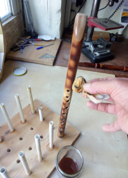 La técnica de decoración que más empleamos es la pirografía, a veces conbinada en collage con impresiones gráficas e incrustaciones diversas; dado el caso también usamos cuero, metales e hilos encerados. Según el tipo de instrumento las impregnaciones del acabado pueden ser tanto internas como externas, haciendo uso de aceites, ceras o lacas.