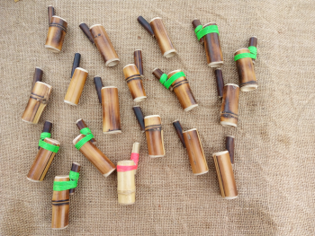 El instrumento se compone de dos porciones de bambú de diferente diámetro unidos oblicuamente; se agarra por los costados con el pulgar e índice de la mano izquierda y se sopla por el tubo delgado. Para obtener diversos efectos sonoros se experimenta con el soplo, con la articulación de la lengua y con el pulgar e índice de la mano derecha en los extremos del tubo grueso.