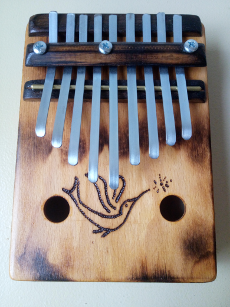 Nuestra kalimba ha ido por fases de desarrollo que probablemente seguirán. La caja de resonancia es un rompecabezas de maderas unidas herméticamente y trabajadas en su interior; el mecanismo de tensión es en madera dura y los flejes son de acero pulido y amigables para el rosar de los dedos. El clásico agujero central fué reducido a su equivalente de dos más pequeños, los cuales se adaptan facilmente a la ubicación y tamaño de los pulgares y facilitan la oscilación típica del sonido conocido como efecto wa-wa. La decoración es variada y por lo general utilizando pirografía; para el acabado se pasan hasta 7 capas de goma laca.